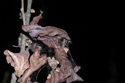 夜の観察。 粘球を作っている個体を観察できた。 Bエリア このムツトゲが後で蛾を捕らえる。 蛾を捕らえた直後で貯食行動もしている 捕まった蛾は、体長1.5CMくらいか。 種名はわからない残念なことに他の個体を見ている間に蛾を捕まえたので、蛾を捕らえる…